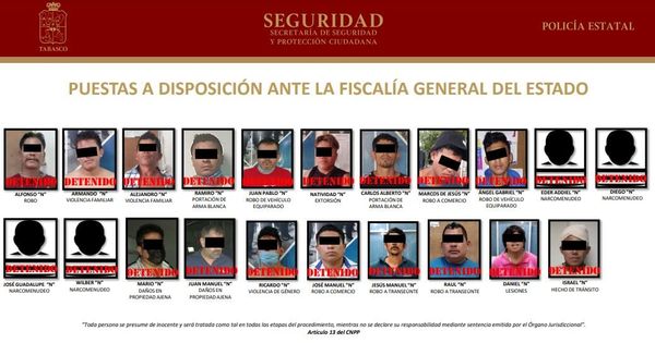 Por delitos como robo a transeúnte, comercio, vehículo, violencia familiar, portación de arma blanca, lesiones, narcomenudeo entre otros, fueron puestos a disposición de la Fiscalía General del Estado (FGE) 21 presuntos responsables.