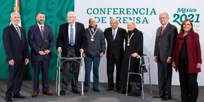 “Nos da mucho gusto que en Palacio Nacional se entreguen estos reconocimientos muy merecidos. (…) Dos sabios en sus especialidades. Creo que es un día muy especial para todos los mexicanos, para el gobierno que encabezo, el hacer este homenaje a estas dos personalidades excepcionales”, subrayó.