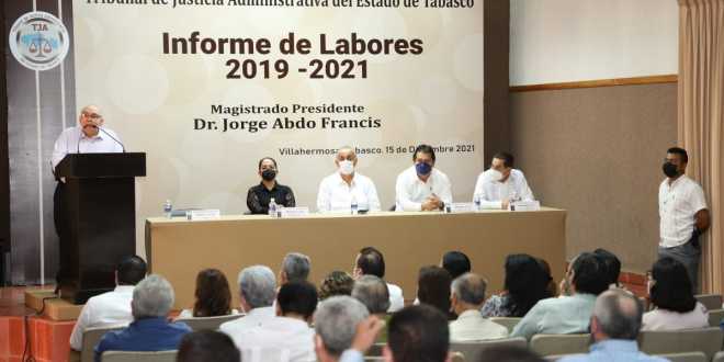 El gobernador Carlos Manuel Merino Campos atestiguó el informe de labores 2019-2021 del magistrado presidente del Tribunal de Justicia Administrativa del Estado de Tabasco, Jorge Abdo Francis, quien reafirmó su postura, convicción y compromiso de continuar una impartición de justicia administrativa integral en la entidad, para que todo promovente sea escuchado y ejerza su derecho de acceso a la justicia.