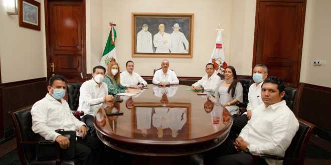 El encuentro se realizó en su despacho de Palacio de Gobierno y lo acompañaron los secretarios de Gobierno, Guillermo del Rivero León, y para el Desarrollo Energético (Sedener), Sheila Guadalupe Cadena Nieto, y la coordinadora de Asuntos Jurídicos, Karla Cantoral Domínguez.
