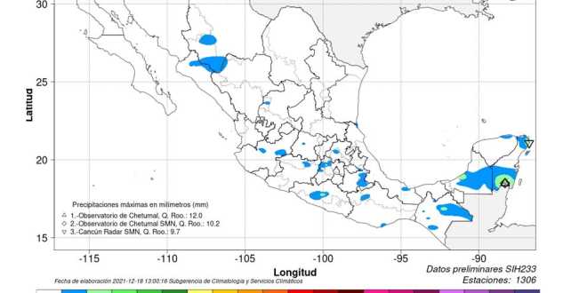 Para hoy sábado, se pronostican lluvias muy fuertes (de 50 a 70 milímetros [mm]) en sitios de Chihuahua, Durango y Nuevo León; puntuales fuertes (de 25 a 50 mm) en zonas de Coahuila, Hidalgo, Quintana Roo, San Luis Potosí, Tamaulipas, y el norte de Veracruz; intervalos de chubascos (de 5 a 25 mm) en localidades de Campeche, Chiapas, Estado de México, Oaxaca, Puebla, Querétaro, Sinaloa, Sonora y Yucatán, así como lluvias aisladas (de 0.1 a 5 mm) en regiones de la Ciudad de México, Guanajuato, Guerrero, Jalisco, Michoacán, Morelos, Tabasco, Tlaxcala y Zacatecas.