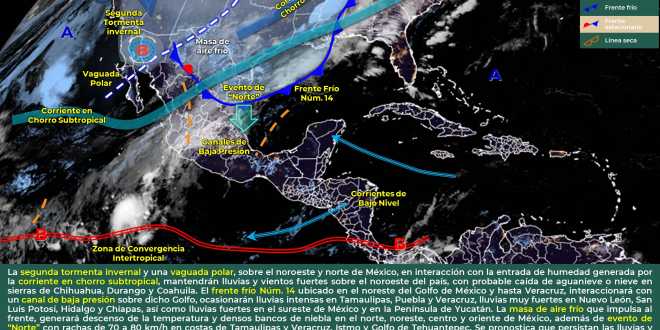 Informó que las precipitaciones podrían darse debido a la masa de aire frío que impulsa el frente frío número 14 y un canal de baja presión, que se extenderá desde el Noreste del Golfo de México hasta Veracruz.
