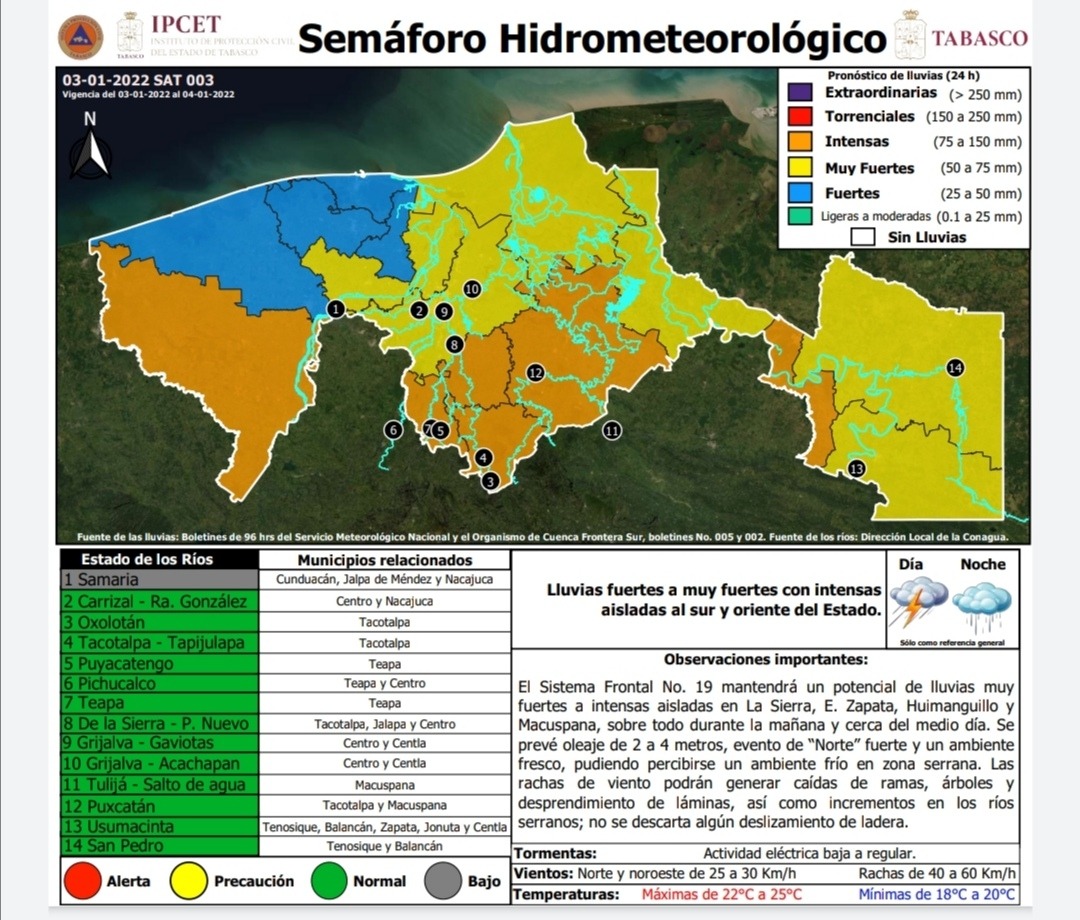 El Instituto de Protección Civil del Estado de Tabasco (IPCET), reporta que el Sistema Frontal No. 19 mantendrá un potencial de lluvias fuertes a muy fuertes e intensas aisladas, en el sur y oriente del estado.