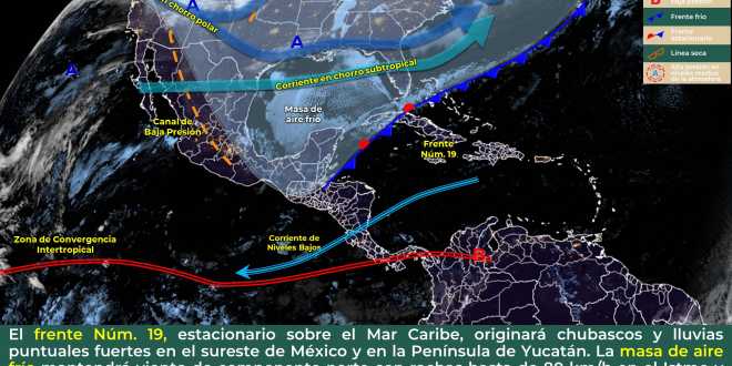 El Instituto de Protección Civil del Estado de Tabasco (IPCET), reporta que los remanentes del Frente Frío Número 19 mantendrán cielo nublado, con lloviznas intermitentes a lluvias moderadas, durante el día, en la región de Los Pantanos, y los municipios de Cárdenas, Emiliano Zapata, Huimanguillo, Tacotalpa, Teapa y Tenosique.