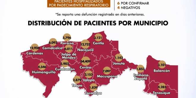 En la distribución de pacientes por municipios, Centro mantiene 64 mil 409 casos; Cárdenas, 12 mil 924; Nacajuca, 12 mil 732; Macuspana, 7 mil 97; Comalcalco, 6 mil 93; Jalpa de Méndez, 6 mil 11; Cunduacán, 5 mil 903; Paraíso, 5 mil 796; y Huimanguillo, con 4 mil 546 contagios.