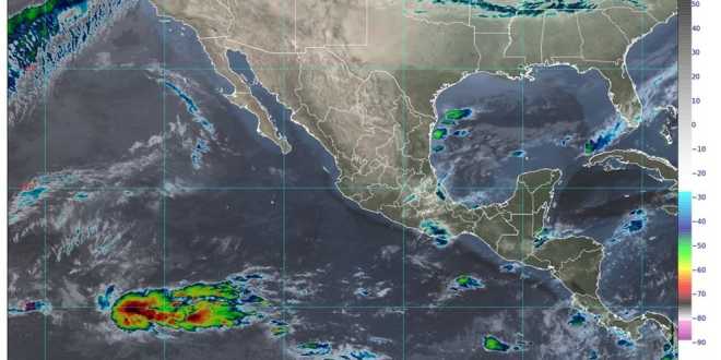 Por otra parte, un sistema anticiclónico en niveles medios de la atmósfera mantendrá condiciones de tiempo estable con cielo despejado, ambiente vespertino de cálido a caluroso y sin probabilidad de lluvia sobre el noroeste y occidente del territorio nacional. Se pronostican temperaturas máximas de 35 a 40 grados Celsius en la costa de Chiapas, Guerrero, Michoacán y el Istmo de Tehuantepec, y de 30 a 35 grados Celsius en Campeche, Colima, Jalisco, Morelos, Nayarit, suroeste de Puebla, oriente de San Luis Potosí, Sinaloa, Tabasco, Tamaulipas, Veracruz y Yucatán.