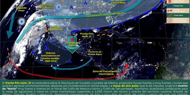 El frente frío número 21 continúa desplazándose sobre la región, por lo que podrían presentarse este martes lluvias fuertes a muy fuertes aisladas en la subregión Sierra y los municipios de Cárdenas, Comalcalco, Centla, Huimanguillo y Paraíso.