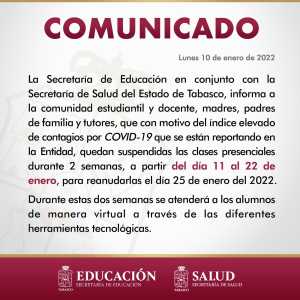 A través de un comunicado, emitido cerca de las 16:00 horas, la Secretaría de Educación, en conjunto con la Secretaría de Salud, dio a conocer “a la comunidad estudiantil y docente, madres, padres de familia y tutores, que con motivo del índice elevado de contagios por COVID-19 que se están presentando en la entidad, quedan suspendidas las clases presenciales durante dos semanas, a partir del día 11 y hasta el 22 de enero, para reanudarlas el día 25 de enero del 2022”.