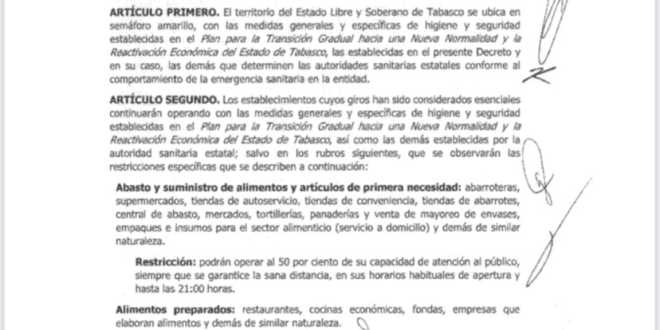 Tabasco transitó este domingo a semáforo epidemiológico amarillo debido al acelerado repunte de contagios COVID, y determinó acciones extraordinarias de inmediata ejecución que consideran restricciones en horarios y aforos de establecimientos esenciales y no esenciales, con el objetivo de contener la cuarta ola de la pandemia.