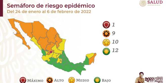 Con 12 entidades federativas en color verde, 10 en amarillo, nueve en naranja y solo una en rojo, el próximo lunes entra en vigor el Semáforo de Riesgo Epidémico COVID-19 que tendrá vigencia del 24 de enero al 6 de febrero, informa la Secretaría de Salud.