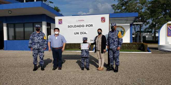 Esta mañana, en las instalaciones de la Base Aérea Militar número 16 en San Carlos, Macuspana, se llevó a cabo la entrega del reconocimiento “Soldado por un día”, al menor de 8 años, Evaristo Sarao Hernández.