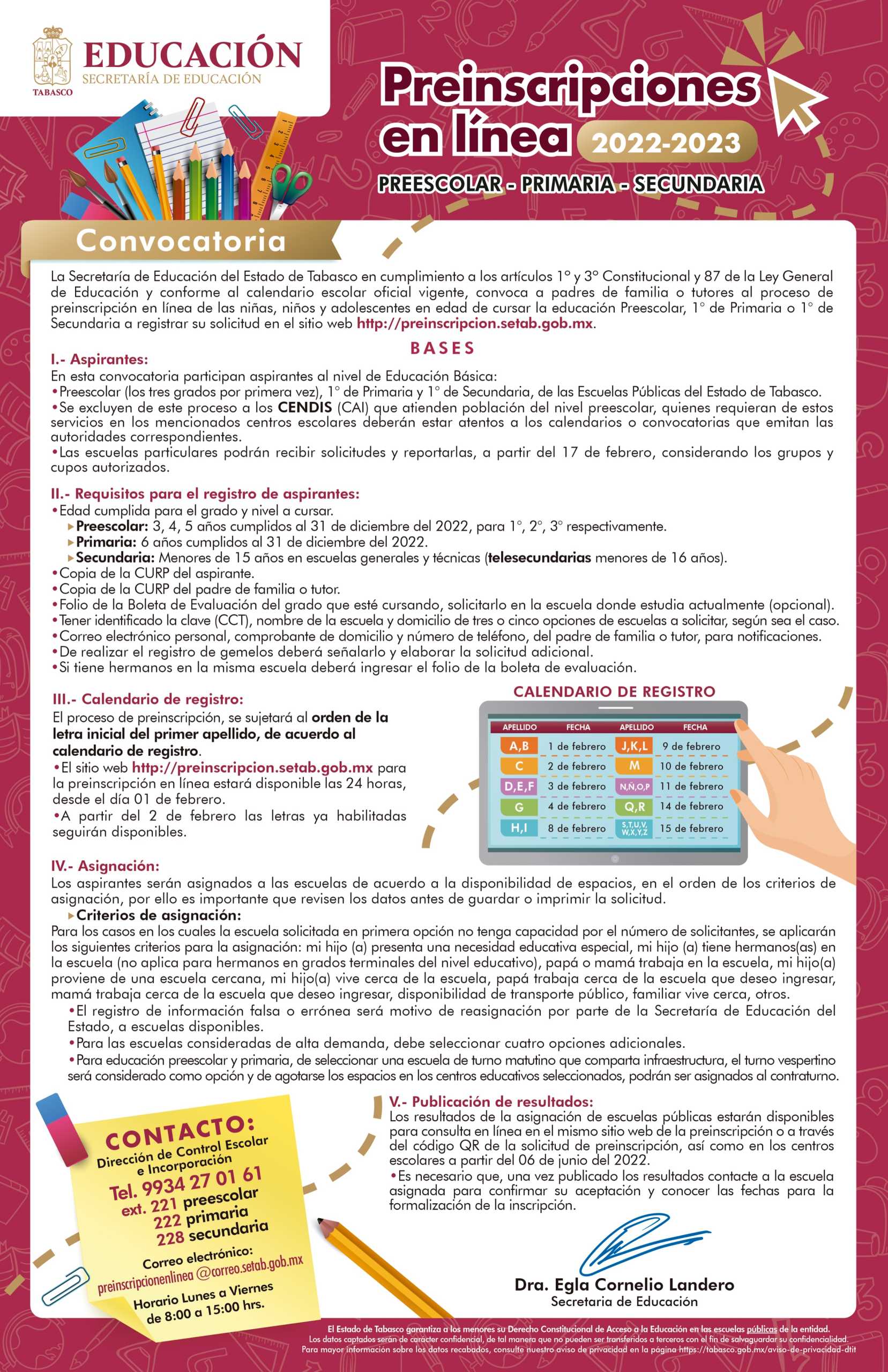 La Secretaría de Educación del Estado de Tabasco (Setab) lanzó este lunes la convocatoria para que padres de familia preinscriban en línea a sus hijos para cursar su educación preescolar, primaria y secundaria en el periodo 2022-2023, y registrar su solicitud en el sitio web http://preinscripcion.setab.gob.mx
