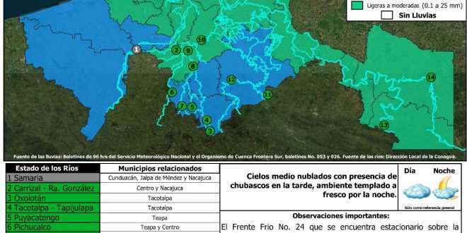 El Instituto de Protección Civil del Estado (IPCET), informó que el frente frío número 24 que se encuentra estacionario sobre la península de Yucatán más el ingreso de humedad en el sureste mexicano, estarían provocando lluvias puntuales de 25.1 a 50.0 milímetros (sin descartar registros superiores) en las subregiones de la Chontalpa y Sierra, así como lluvias moderadas de 5.1 a 25.0 milímetros en el resto del estado.