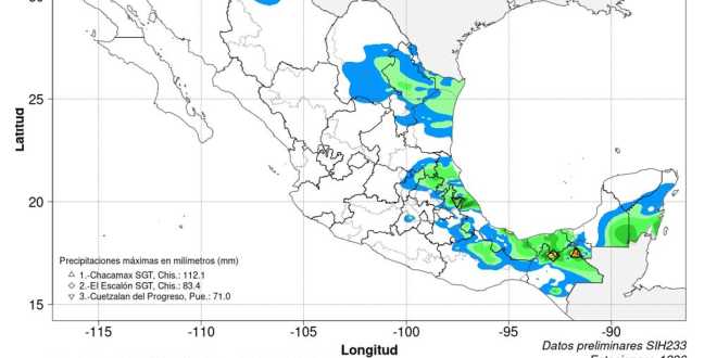 El pronóstico para este sábado es de lluvias puntuales intensas (de 75 a 150 milímetros [mm]) en el norte de Chiapas, el oriente de Oaxaca y el sur de Veracruz; muy fuertes (de 50 a 75 mm) en el sur de Tabasco; fuertes (de 25 a 50 mm) en el suroeste de Campeche y el sureste de Puebla; intervalos de chubascos (de 5 a 25 mm) en Guerrero, Quintana Roo y Yucatán, y lluvias aisladas (de 0.1 a 5 mm) en Baja California, Ciudad de México, Estado de México, Hidalgo y Michoacán.
