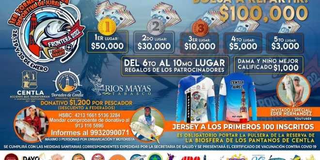 Con una bolsa de 100 mil pesos, a repartir en premios, arrancó este día, el Primer Torneo de Pesca del Jurel Frontera 2022, impulsado por la Secretaría de Turismo y con la participación de aficionados de la región, a desarrollarse en los Ríos Grijalva, San Pedro y Usumacinta, del 28 al 30 de enero.