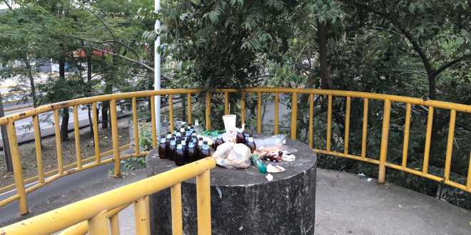 Además de basura de los peatones, en el sitio es posible también observar los desechos de quienes se instalan un buen rato a tomar bebidas embriagantes.