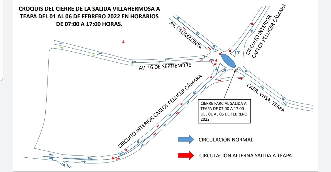 Elementos de la Policía Estatal de Caminos (PEC) realizarán un dispositivo de orientación derivado de trabajos que se efectuarán en las inmediaciones de la glorieta Framboyanes en Villahermosa del 01 al 06 de febrero de 7:00 a 17:00 horas. De acuerdo al cierre parcial que se llevará a cabo en la glorieta Framboyanes con dirección a la salida Villahermosa a Teapa de la colonia Guayabal, se tomarán vías alternas sobre el Circuito interior Carlos Pellicer Cámara, teniendo como retorno a la altura de la gasolinera Jojicha, para incorporarse al carril habilitado a un costado del fraccionamiento Marcos Buendía.