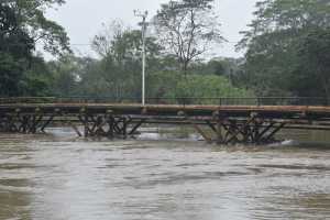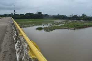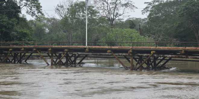 El agua casi alcanza el puente en Vuelta y Rayón, en Teapa