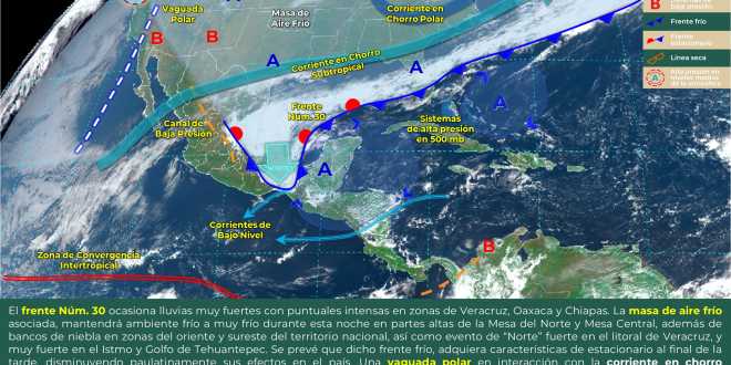 Las condiciones descritas serán generadas por el frente número 30, que se extenderá con características de estacionario sobre el sur de Veracruz, en interacción con un canal de baja de presión ubicado sobre la Península de Yucatán, la masa de aire frío asociada al sistema frontal, la corriente en chorro subtropical y por la entrada de humedad del Océano Pacífico.
