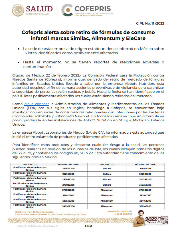 La Comisión Federal para la Protección contra Riesgos Sanitarios (Cofepris), informa que, derivado del retiro de mercado de fórmulas infantiles en Estados Unidos llevado a cabo por la empresa Abbott Nutrition, esta autoridad desplegó el fin de semana acciones preventivas y de vigilancia para garantizar la seguridad de personas recién nacidas y bebés. Hasta la fecha se han identificado en el país 16 lotes posiblemente afectados, los cuales están siendo retirados del mercado.