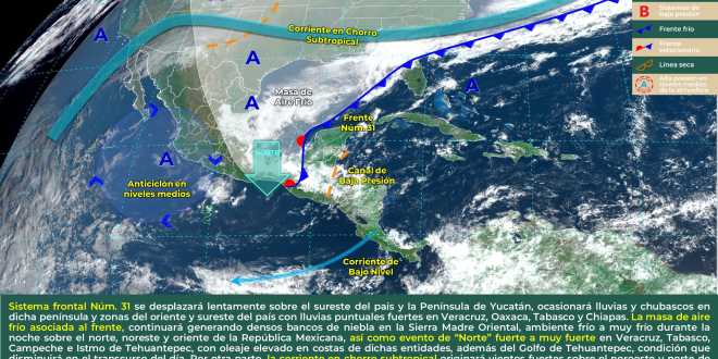 Las condiciones atmosféricas mencionadas serán originadas por el frente número 31, que se desplaza lentamente desde el sureste del país hasta la Península de Yucatán, la masa de aire frío asociada al sistema y por la corriente en chorro subtropical.