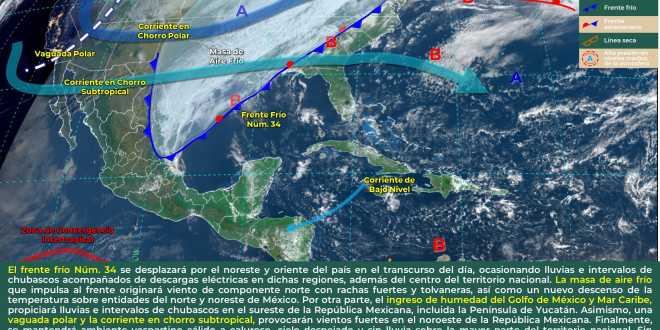 Durante este lunes, el Frente Frío Número 34 se desplazará sobre el noreste de México, y en interacción con canales de baja presión en el oriente del país y el sur del Golfo de México provocará chubascos (de 5 a 25 milímetros [mm]) en Hidalgo, Puebla, Quintana Roo, San Luis Potosí y Tamaulipas, y lluvias aisladas (de 0.1 a 5 mm en Campeche, Chiapas, Ciudad de México, Estado de México, Guanajuato, Morelos, Nuevo León, Oaxaca, Querétaro, Tlaxcala, Veracruz y Yucatán.