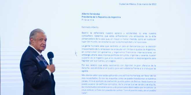 En conferencia de prensa matutina, leyó la misiva que fue entregada por la doctora Beatriz Gutiérrez Müller al mandatario de Argentina.