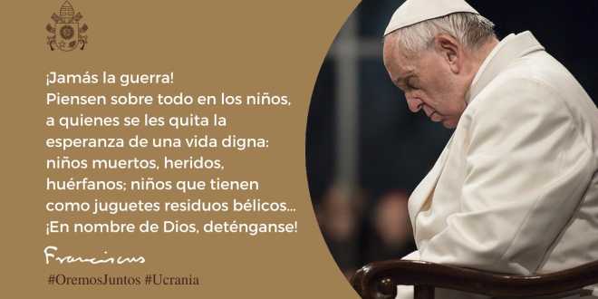 “¡Jamás la guerra! Piensen sobre todo en los niños, a quienes se les quita la esperanza de una vida digna: niños muertos, heridos, huérfanos; niños que tienen como juguetes residuos bélicos ¡En nombre de Dios, deténganse!”, destacó.