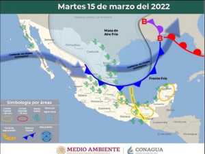El miércoles, el frente frío Núm. 36 se extenderá sobre el sureste de México y la Península de Yucatán, ocasionando chubascos y lluvias puntuales fuertes en las mencionadas regiones, mientras que la masa de aire frío asociada modificará sus características térmicas. El jueves, el frente se localizará con características de estacionario sobre el Golfo de México, dejando de afectar al país.
