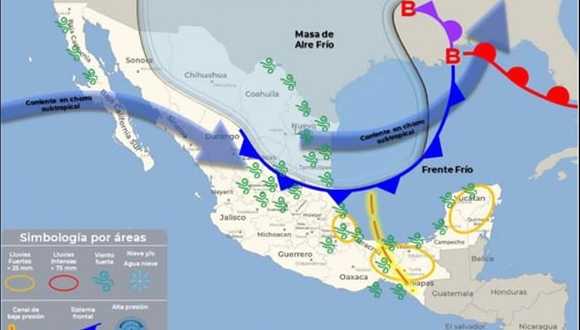 De acuerdo con el Servicio Meteorológico Nacional (SMN), el frente frío Núm. 36 recorrerá rápidamente el noreste, oriente y sureste del territorio nacional, ocasionando chubascos y lluvias fuertes a muy fuertes acompañadas de actividad eléctrica y posibles granizadas en las mencionadas regiones, así como en la Mesa Central, con tormentas puntuales intensas en Chiapas. La masa de aire frío asociada al frente, en interacción con la corriente en chorro subtropical, propiciarán rachas fuertes de viento en el norte y noreste del país, además de viento fuerte de componente norte en el litoral del Golfo de México, Istmo y Golfo de Tehuantepec.