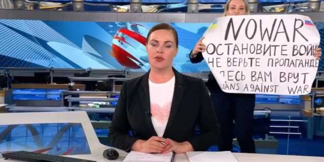 Simultáneamente, la periodista gritó varias veces en medio de la emisión «detengan la guerra» y «no a la guerra».