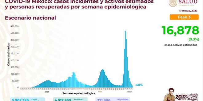 En la semana epidemiológica que se analiza bajó 40 por ciento el número de contagios estimados, mientras que, en los últimos 14 días, 16 mil 878 personas reportaron signos y síntomas de COVID-19, se consideran casos activos y representan 0.3 por ciento del total registrado desde la emergencia sanitaria.