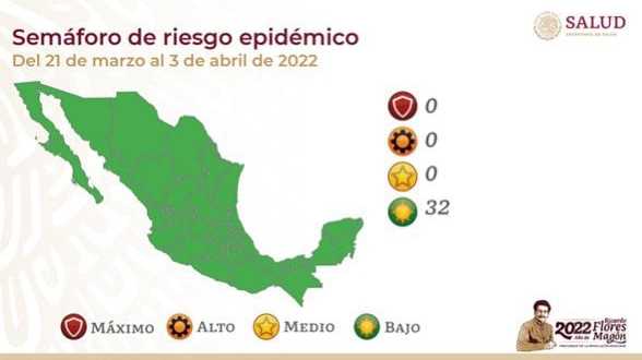 Como resultado de la disminución sostenida de contagios y hospitalizaciones por COVID-19, a partir del próximo lunes 21 de marzo y hasta el 3 de abril, las 32 entidades federativas estarán en color verde del Semáforo de Riesgo Epidémico COVID-19, informa la Secretaría de Salud.