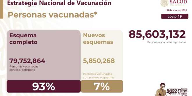 Del total de personas inmunizadas, 79 millones 752 mil 864, que representan 93 por ciento, tienen esquema completo, y cinco millones 850 mil 268, es decir, siete por ciento, cuentan con el primer biológico.