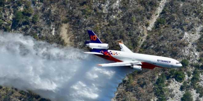 Un avión cisterna McDonnell Douglas DC-10 Air Tanker traído desde Alburquerque, Nuevo México y diseñado para efectuar descargas de agua en incendios forestales, realizó este sábado las primeras pruebas de descarga de agua y retardante sobre el incendio que consume zonas de la Sierra de Santiago, en Nuevo León.