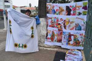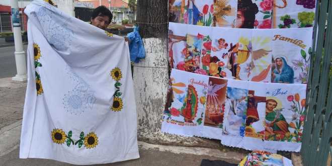 Desde muy tempranas horas en una banqueta cercana al atrio principal de la Catedral El Señor de Tabasco, Gabino Rodríguez se instala para vender ahí sus palias bordadas, aprovechando a la feligresía que llega a las misas matutinas y de mediodía a este importante templo católico.