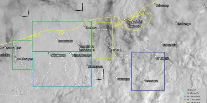 Persistirá cielo nublado con lluvias ligeras en todo el estado; durante las próximas 3 horas se prevén posibles lluvias fuertes de 25.1 a 50.0 mm principalmente en Ríos y lluvias moderadas de 5.1 a 15.0 mm en el sur de la entidad.