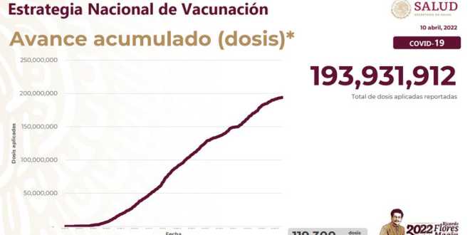 Con corte a las 21:00 h de este 9 de abril, suman 193 millones 931 mil 912 dosis aplicadas contra COVID-19 desde el 24 de diciembre de 2020, de las cuales este sábado se suministraron 77 mil 602.