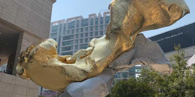 Para el atrio del museo específicamente el artista creó una escultura monumental de 10 metros de altura realizada en aluminio fundido, acero inoxidable y hoja de oro, son dos formas que se encuentran, una en equilibrio sobre la otra.