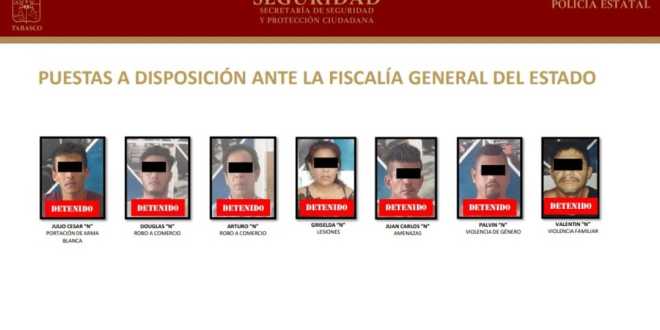 Tal como lo instruye el Secretario Hernán Bermúdez Requena de mantener la vigilancia y seguridad de las personas y sus bienes, en la semana del 11 al 17 de abril, fueron puestas a disposición de la Fiscalía General del Estado (FGE) 7 presuntos responsables relacionados con delitos de robo a comercio, portación de arma blanca, lesiones, amenazas, violencia de género.
