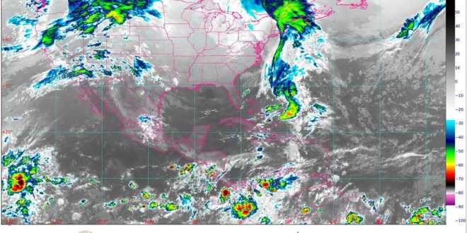 Las condiciones atmosféricas en la Península de Yucatán serán de ambiente matutino cálido con nubes dispersas, cielo medio nublado con ambiente muy caluroso por la tarde y viento del este y noreste con rachas de 50 a 60 km/h en costas de Campeche y Yucatán.