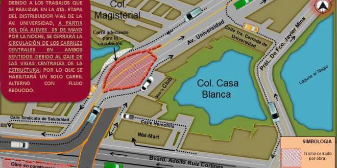 Debido a la realización de trabajos que pertenecen a la cuarta etapa del distribuidor vial de la Avenida Universidad, la Secretaría de Ordenamiento Territorial y Obras Públicas (Sotop) informó que a partir de ayer por la noche quedaron cerrados a la circulación de vehículos los carriles centrales de dicha avenida en ambos sentidos.