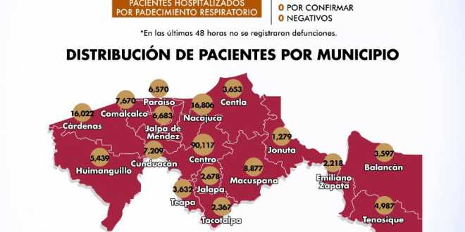 En cuanto a la distribución de pacientes por municipios, Centro alcanzó 90 mil 117 casos; Cárdenas, 16 mil 22; Nacajuca, 16 mil 806; Macuspana, 8 mil 877; Comalcalco, 7 mil 670; Jalpa de Méndez, 6 mil 683; Paraíso, 6 mil 570; Cunduacán, 7 mil 209; Huimanguillo, 5 mil 439.