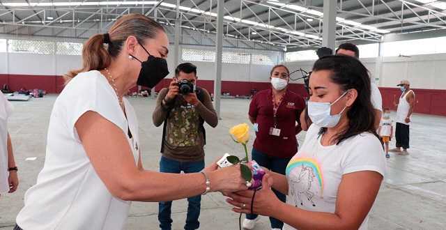 En el Centro de Atención a Migrantes, ubicado en Ciudad Industrial, la esposa del gobernador Carlos Manuel Merino Campos también entregó material didáctico que facilitará la realización de las actividades de recreación y aprendizaje que realizan cotidianamente los pequeños albergados que llegan al lugar.