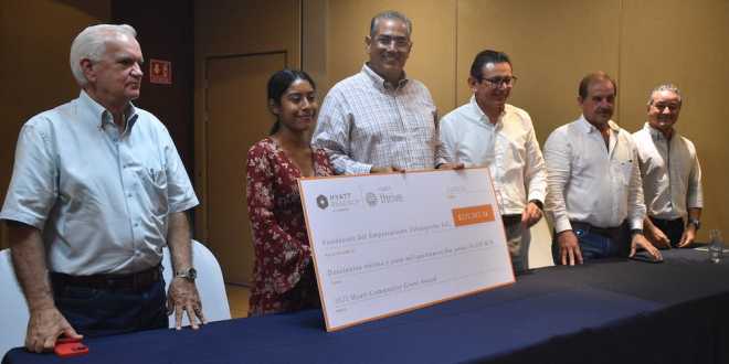Explicó que por tal motivo se realizó una alianza con el hotel Hyatt para la entrega de los 20 apoyos a estudiantes que actualmente cursan el último semestre del nivel medio superior y estén próximos a egresar al nivel superior, y a quienes estén cursando nivel superior, y se encuentren próximos a titularse.