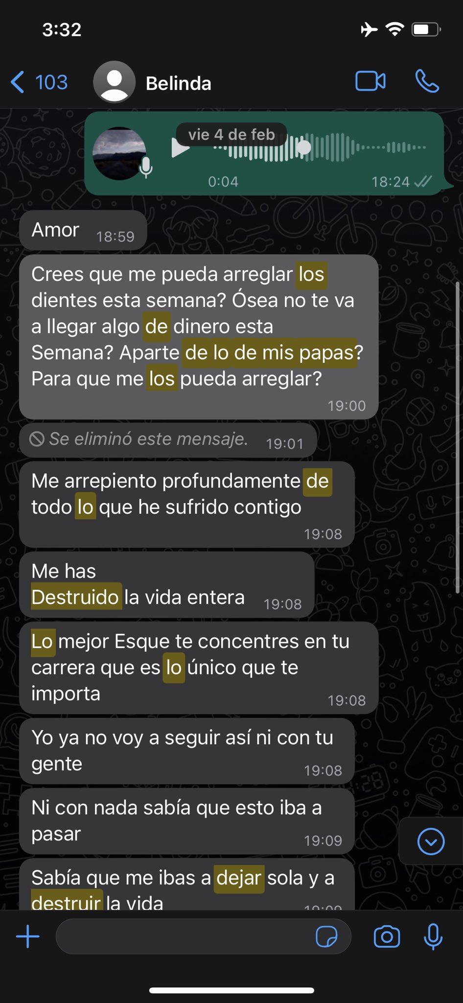“Amor. ¿Crees que me pueda arreglar los dientes esta semana? O sea, ¿no te va a llegar algo de dinero esta semana? ¿A parte de lo de mis papás? ¿Para que me los pueda arreglar?”, le pregunta ella. El mensaje siguiente fue eliminado por Belinda, quien a los siete minutos le envía otra serie.