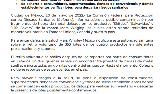 La Comisión Federal para Protección contra Riesgos Sanitarios (Cofepris), informa sobre la posible contaminación por fragmentos de hebra de metal delgada en los productos “Skittles”, “Salvavidas” y “Life Savers”, de la marca Mars Wrigley, los cuales están siendo retirados de manera voluntaria en Estados Unidos, Canadá y nuestro país.