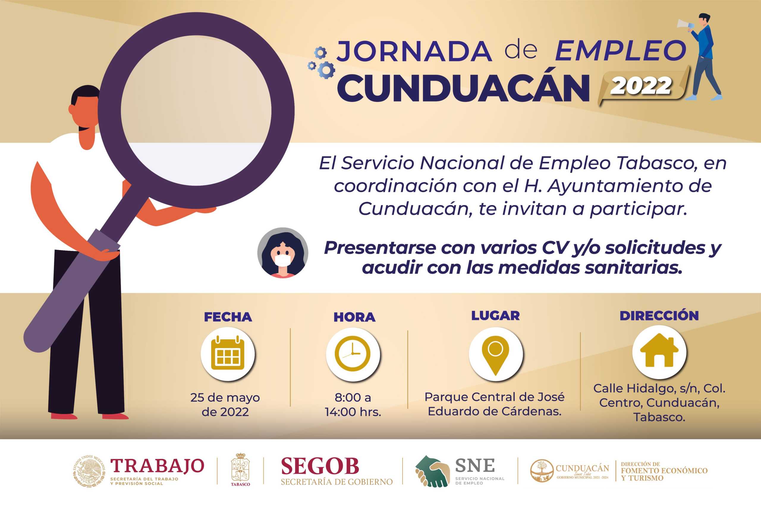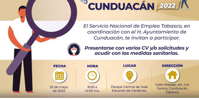 Como una estrategia para fortalecer el empleo en la entidad y con la participación de 16 empresas que ofertarán 319 plazas, el Servicio Nacional de Empleo en Tabasco (SNET), en coordinación con el Ayuntamiento de Cunduacán, realizarán este 25 de mayo, la “Jornada de Empleo Cunduacán 2022.