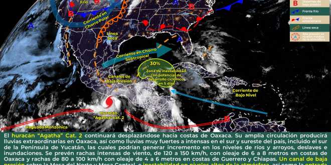 Lluvias intensas acumuladas de 75.1 a 150 milímetros sobre Huimanguillo, Cárdenas, Macuspana, Jonuta y la subregión de los Ríos, se esperan para este lunes a causa de la influencia del huracán “Aghata” en la región sur-sureste, previó el Instituto de Protección Civil del Estado (IPCET).