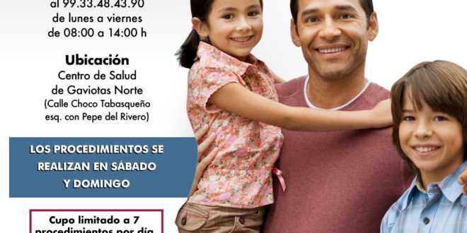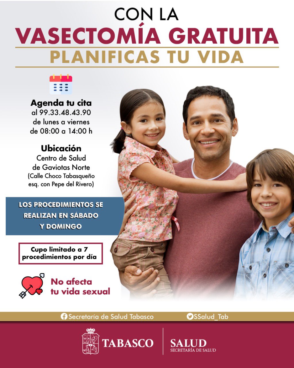 La Secretaría de Salud informa a la población tabasqueña, que el Programa de Salud Reproductiva apertura un “Modulo de Vasectomía”, en el Centro de Salud con Servicios Ampliados de Gaviotas Norte, en el que se estarán efectuando estos procedimientos de planificación familiar totalmente gratuitos.